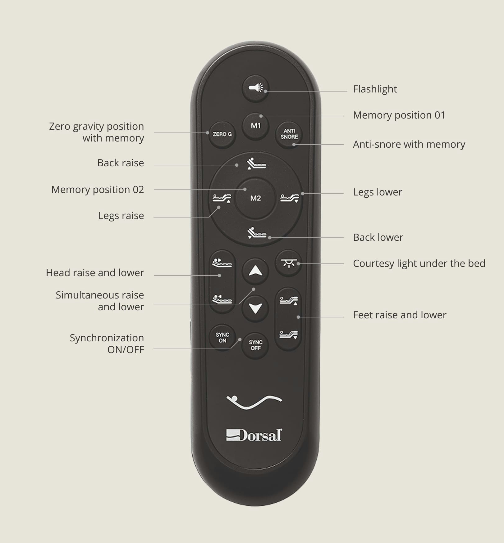 The remote control that allows you to operate the motorised slatted base (with legs) with Bliss R-4 technology. Equipped with as many as 4 programmable memories with innovative presets Gravità Zero and Anti-rushing.